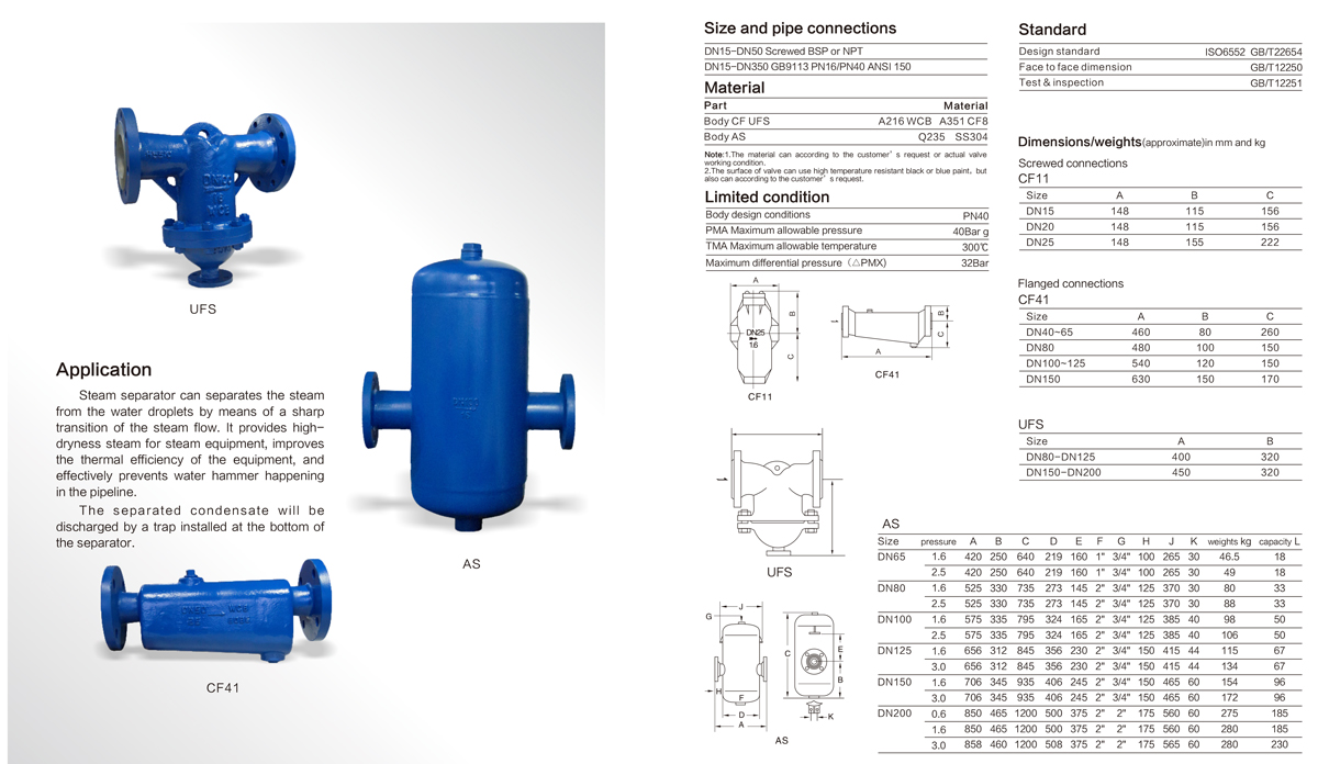汽水分離器為壓力容器結(jié)構(gòu)碳鋼或不銹鋼設(shè)備,須安裝于水平管線上,排水口垂直向下,所有口徑的汽水分離器均帶安裝支架,以減小管道承載。為確保被分離的液體迅速排放,應(yīng)在分離器底部的排水口連接合適的一套疏水閥組合。 汽水分離器用于蒸汽、壓縮空氣及其它氣體系統(tǒng)可除去蒸汽、空氣或氣體等系統(tǒng)中所含水分。本類閥門在管道中一般應(yīng)當(dāng)水平安裝