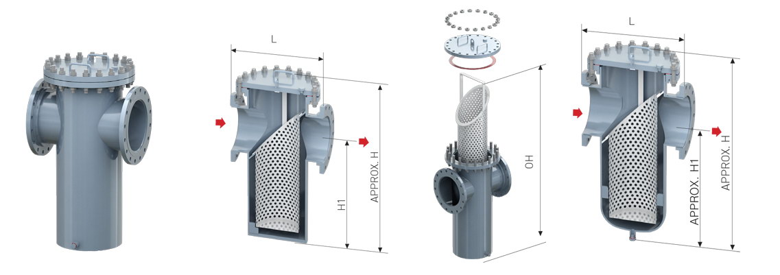 進口直通籃式過濾器的進口出口在一個水平位置上,由一個主單筒與進口出口組成,用于攔截管道介質里的雜質。在生產(chǎn)過程中,流體會隨著管道流經(jīng)過濾器,液體先通過筒體而后進入濾籃,流體從濾籃中流出直至過濾器的出口排出,其中的固體雜質顆粒為濾籃所阻擋,與流體分離完成過濾。過濾器使用一段時間后,固體雜質在濾籃中堆積,這時只要旋開主管底部的螺塞,將直通過濾器內的液體排凈,拆卸法蘭,清洗過濾籃后重新裝入。