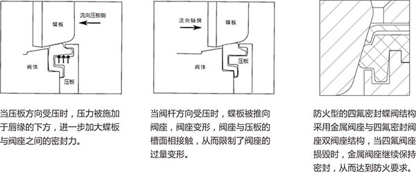 1、由于采用雙偏心結構,閥門在開啟過程中,蝶板逐漸脫離閥座,減少了密封面之間的摩擦,從而延長了使用壽命。閥座采用唇形結構設計, 材質用PTFE, RPTFE或超高分子量的聚乙烯,不管流體的方向如何,閥座變形后總能恢復到原先的位置,保證密封。