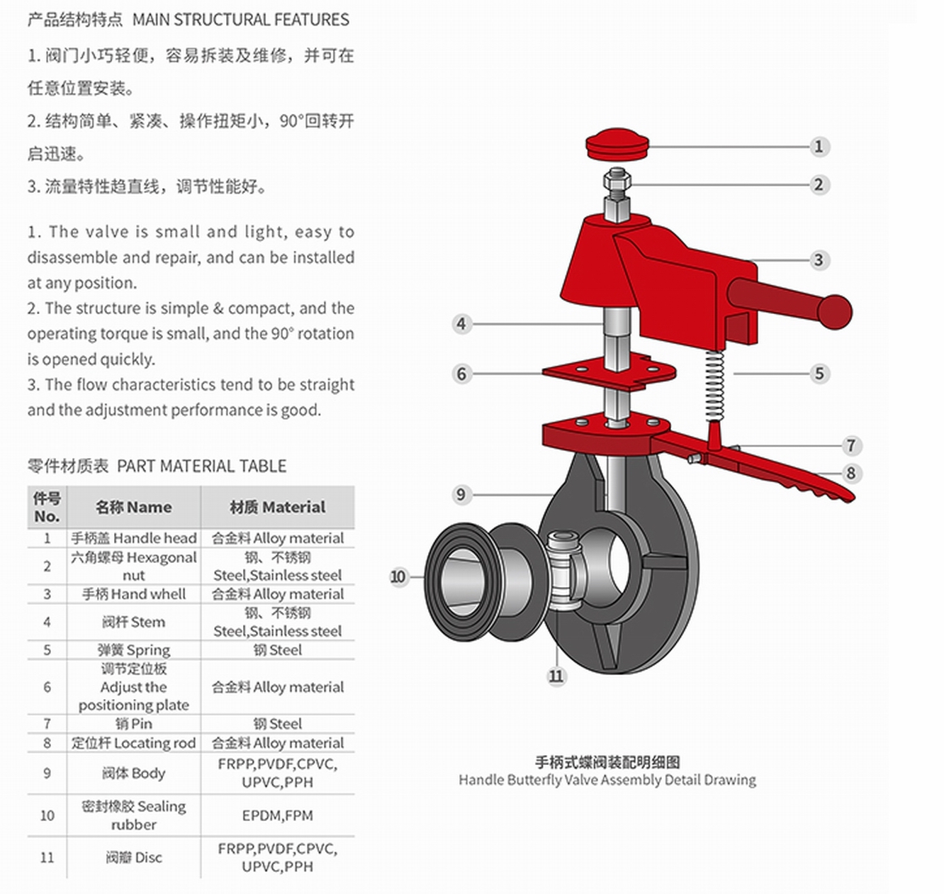 進口塑料蝶閥,閥體材質(zhì)應(yīng)以PPH、RPP、PE、PVDF、CPVC、UPVC原料制成,密封座采用三元乙丙橡膠(EPDM)或氟橡膠(FPM)制成。