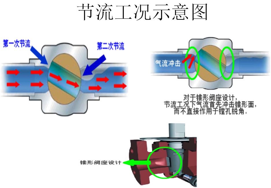 對于錐形閥座設(shè)計(jì)的旋塞閥,節(jié)流工況下氣體流入閥芯時(shí),氣流首先沖擊它前面錐形閥座的錐面,通過錐面的導(dǎo)向作用該表方向后進(jìn)入閥芯,而不是直接沖擊閥芯鏜孔的銳角,加之閥芯可以根據(jù)節(jié)流工況設(shè)計(jì)多樣的流動(dòng)面、形狀和功能所以旋塞閥可以用于節(jié)流工況。