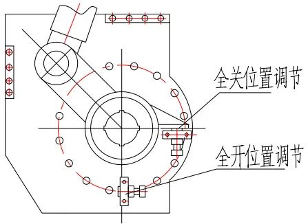 (3)蝶閥全開位置的調(diào)整(出廠時已調(diào)好,如有變動需重調(diào)):調(diào)整方法見圖(2),先將全開位置調(diào)節(jié)螺栓向上調(diào)節(jié),待蝶板全開(即活塞桿全部伸出到位)后再將螺栓向下調(diào)節(jié),頂緊連桿消除機械連接的間隙,然后緊固螺母即可